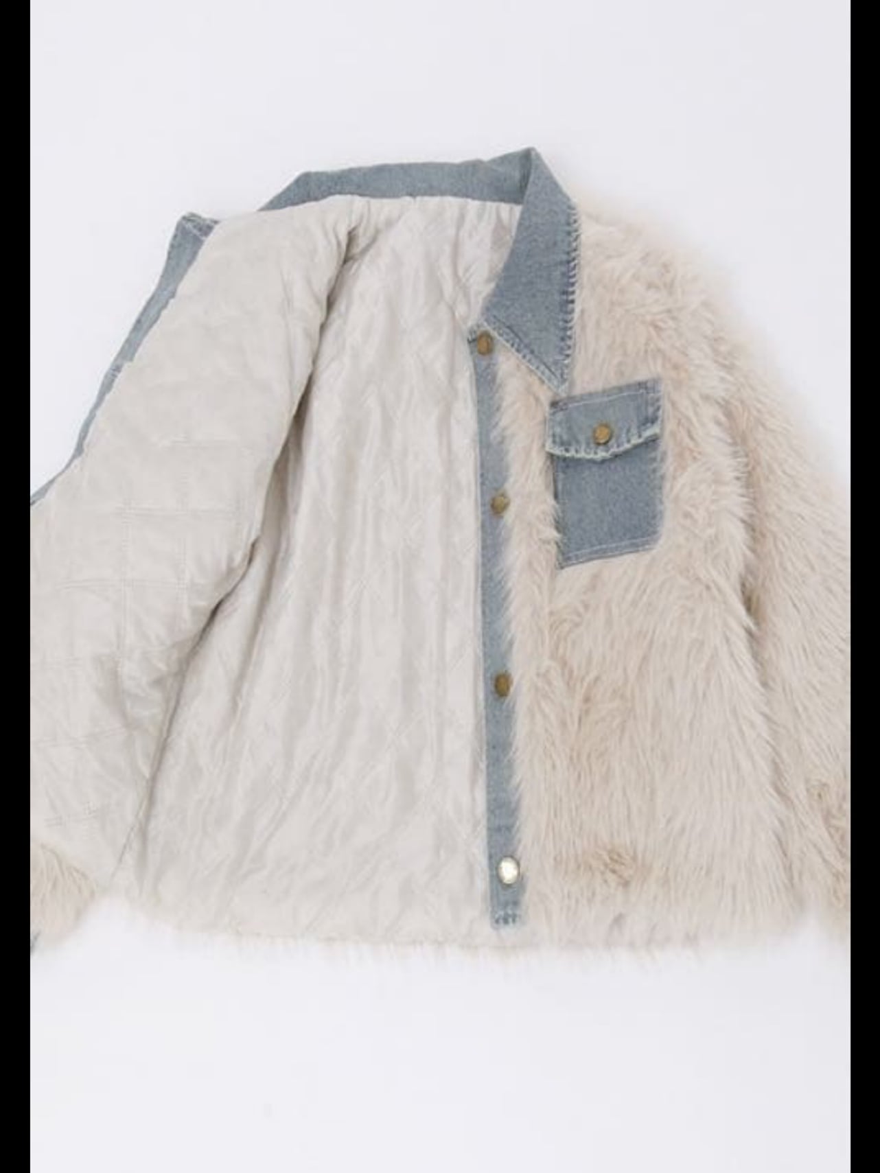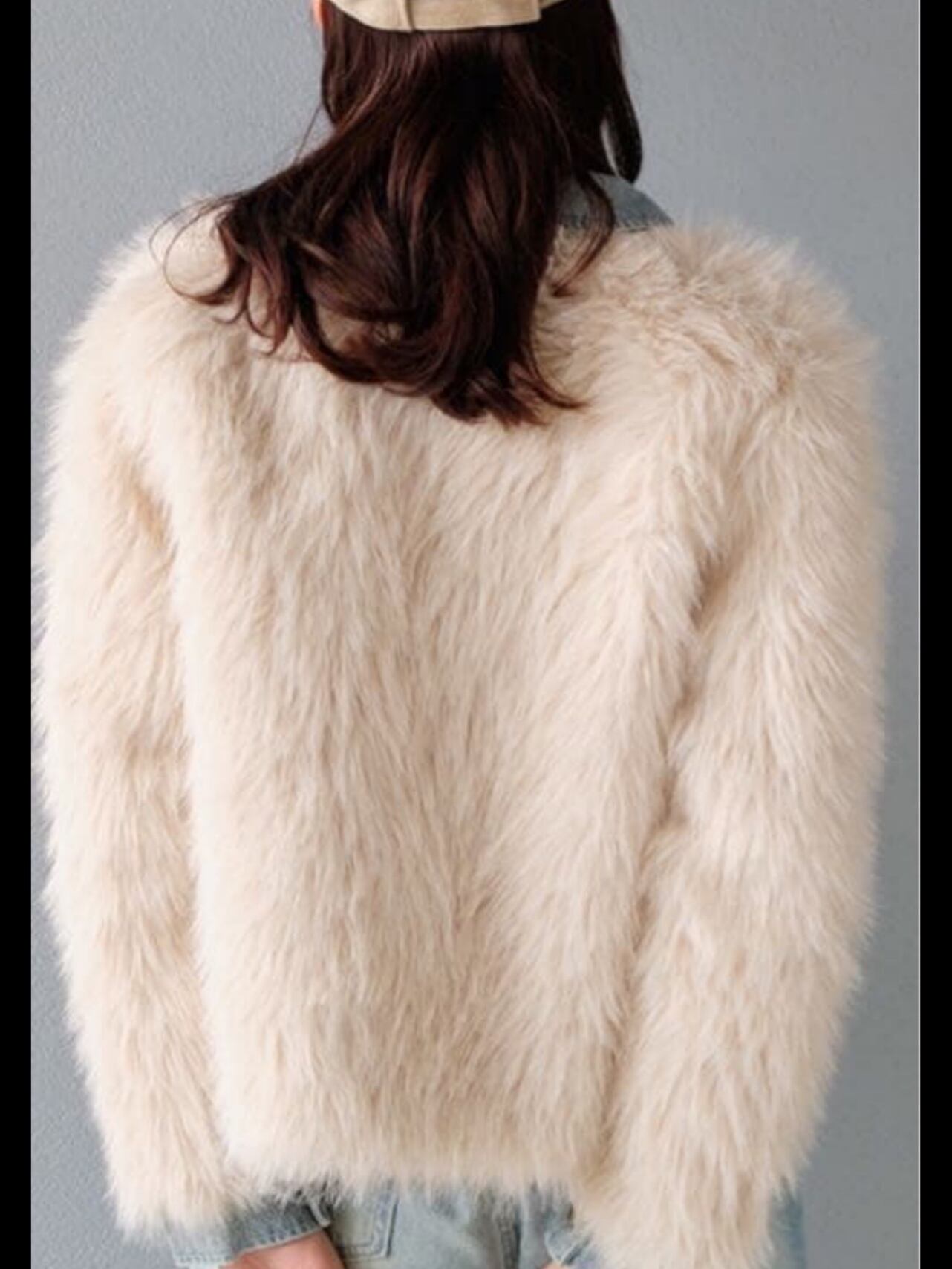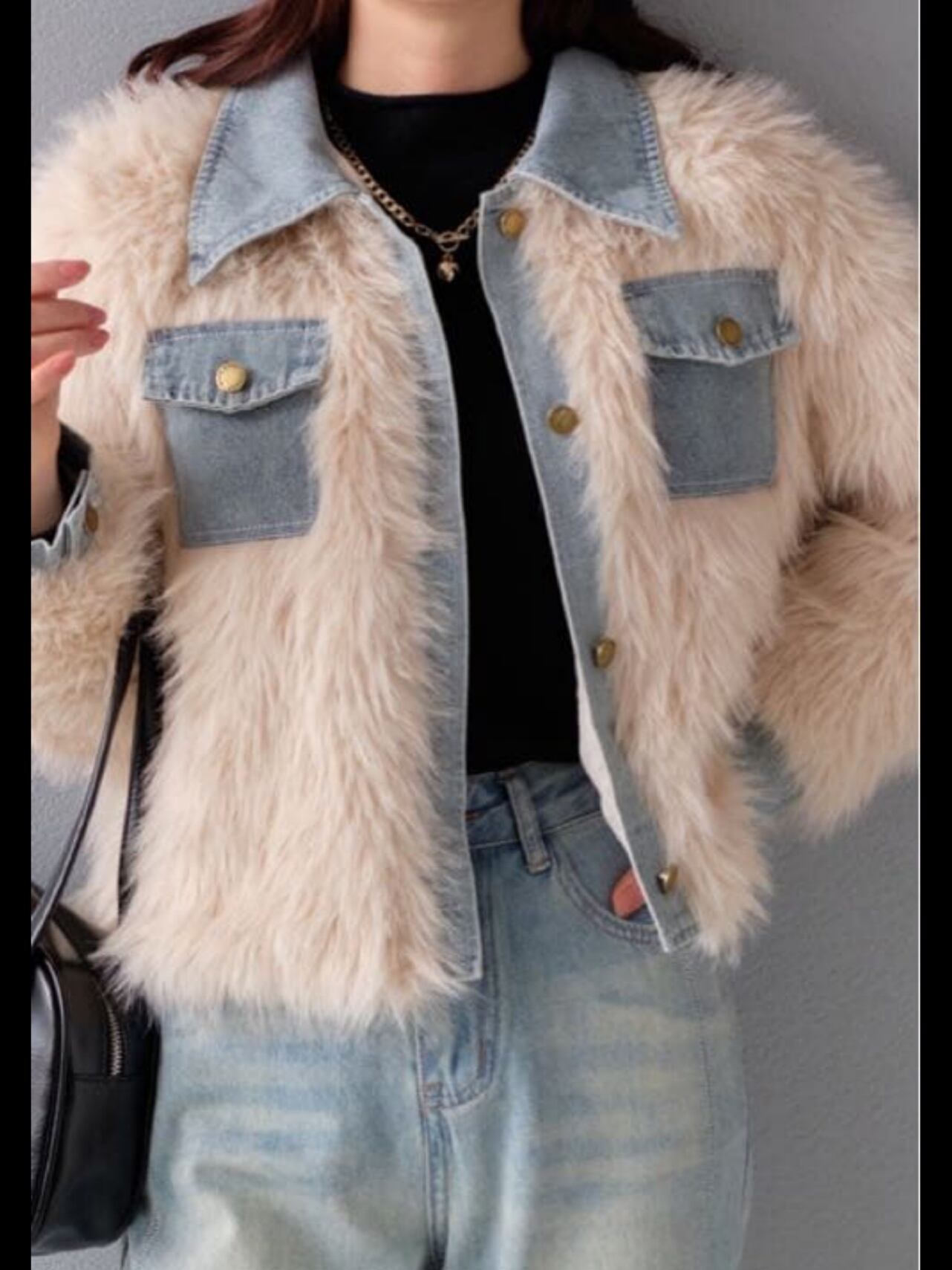 ふわふわの毛足の長いフェイクファーとデニム素材のコントラストがシーズンムードなボリュームジャケット。ゆるっとしたボックスシルエットで大人っぽく着ていただけます。